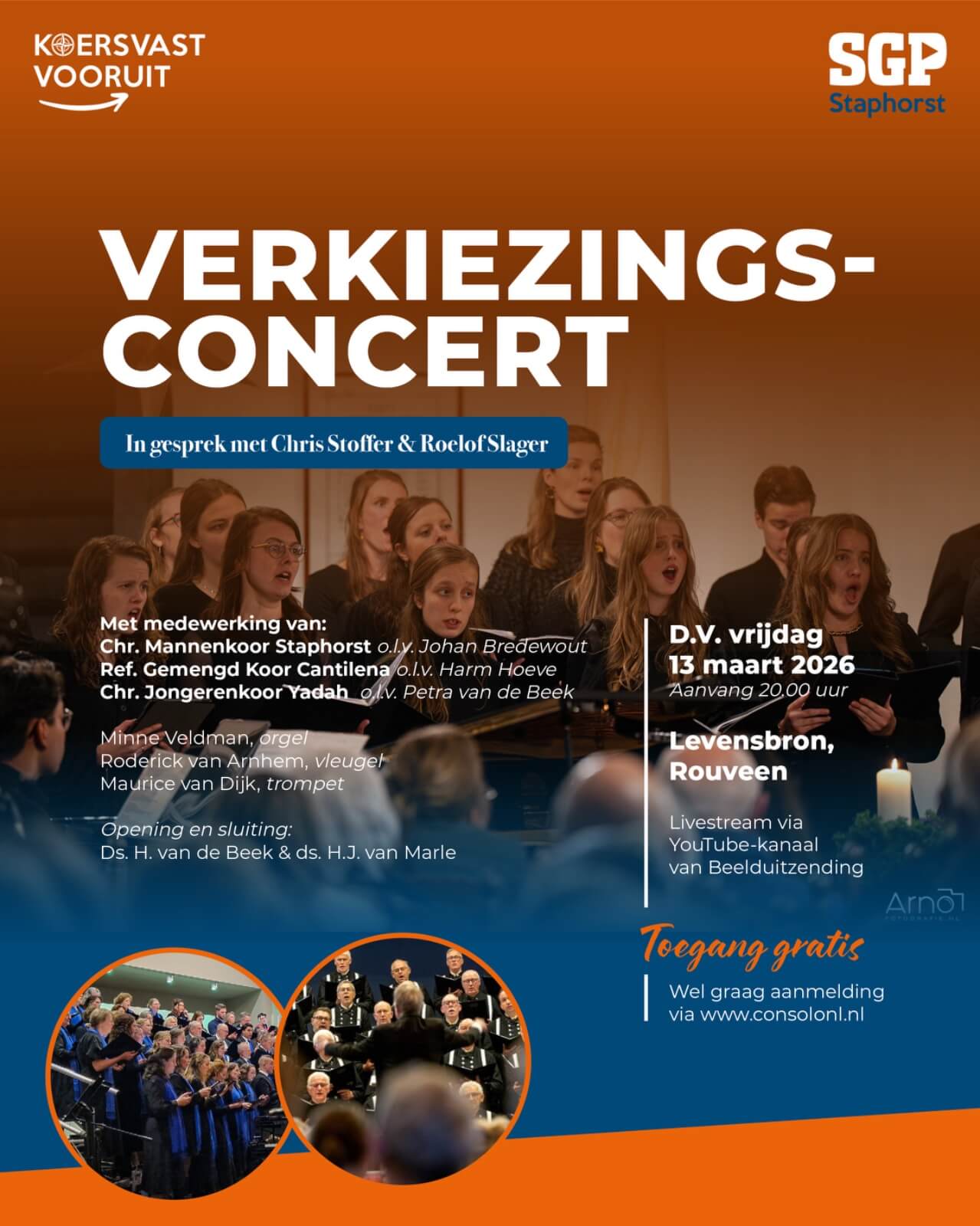 Op D.V. vrijdag 13 maart 2026 vindt in Levensbron te Rouveen een bijzonder verkiezingsconcert plaats. Diverse koren uit Staphorst en omgeving verlenen hun medewerking, met muzikale begeleiding van orgel, vleugel en trompet. Daarnaast gaan we met Chris Stoffer en Roelof Slager in gesprek.
